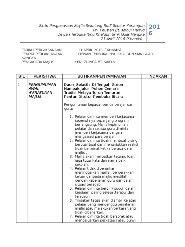 Mencari pengacara majlis untuk majlis anda? Genting international convention centre masa : Tuan, saya ambil skrip pengacaraan yg tuan buat sebagai contoh kpd anak didik saya yg akan menjadi pengacara majlis persaraan cikgu di sekolah. Kamarul azirah binti kamaruddaman contoh teks pengacara majlis etika pengacara majlis etika pengacara majlis. · format penulisan skrip pengacaraan majlis.